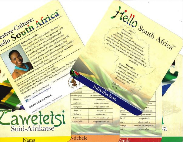 The author of Creative Culture: The Heart and Soul of South Africa, brings you 12 cards based on this book. Her insightful way of presenting South African languages in this one of a kind deck of cards, will encourage all culture groups to welcome and appreciate differences as each culture maintains its identity. As a result, from now on onwards you will know what and how to say to people of other cultural groups.